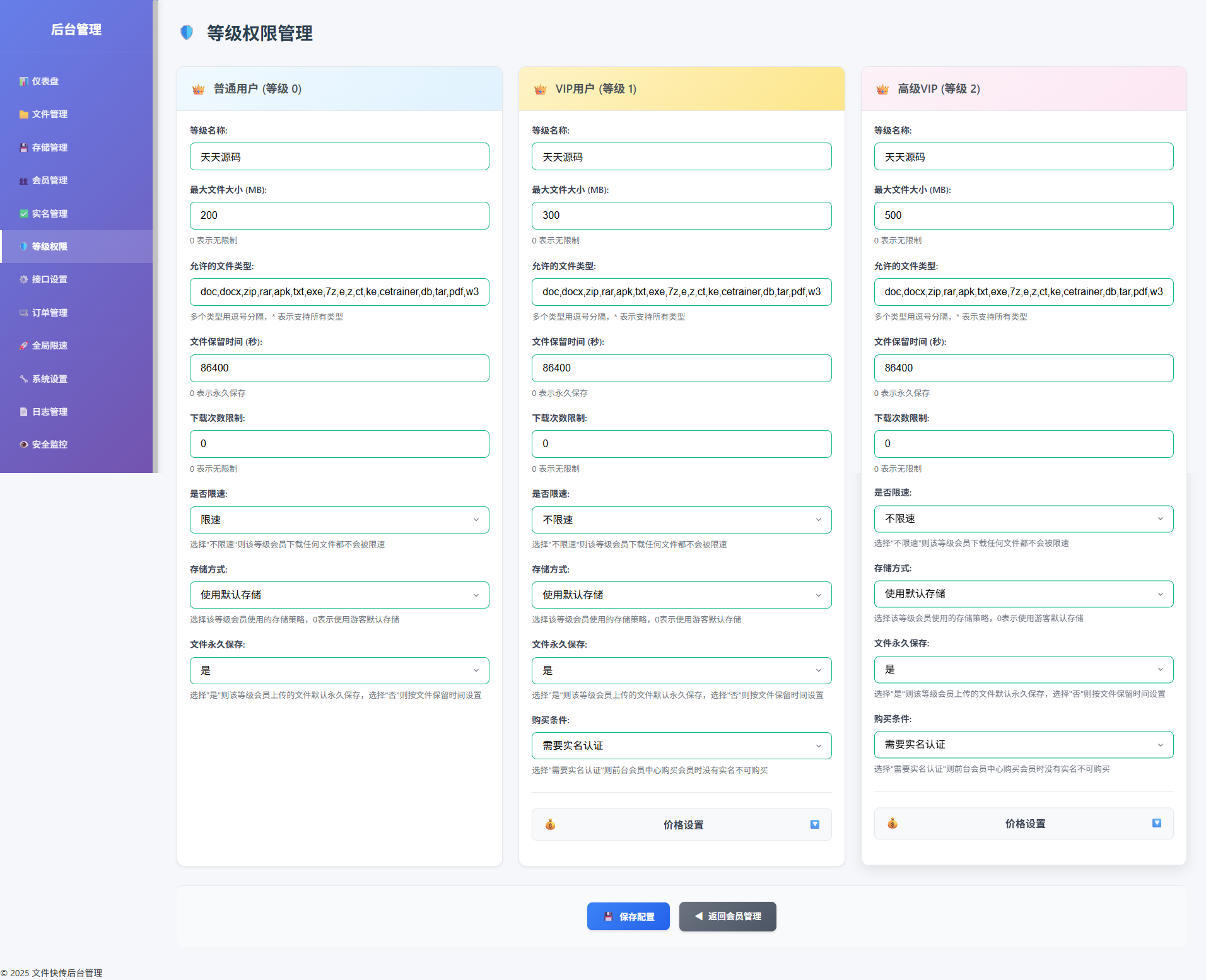 - 新增:后台会员等级权限支持设置每个等级的用户上传的文件,是否默认永久存储。
