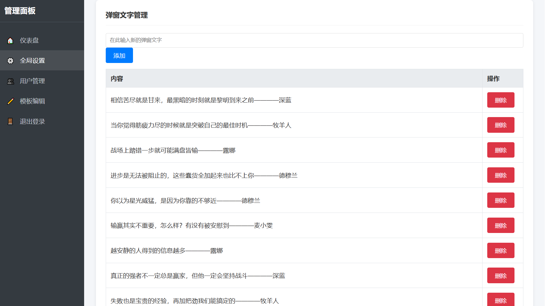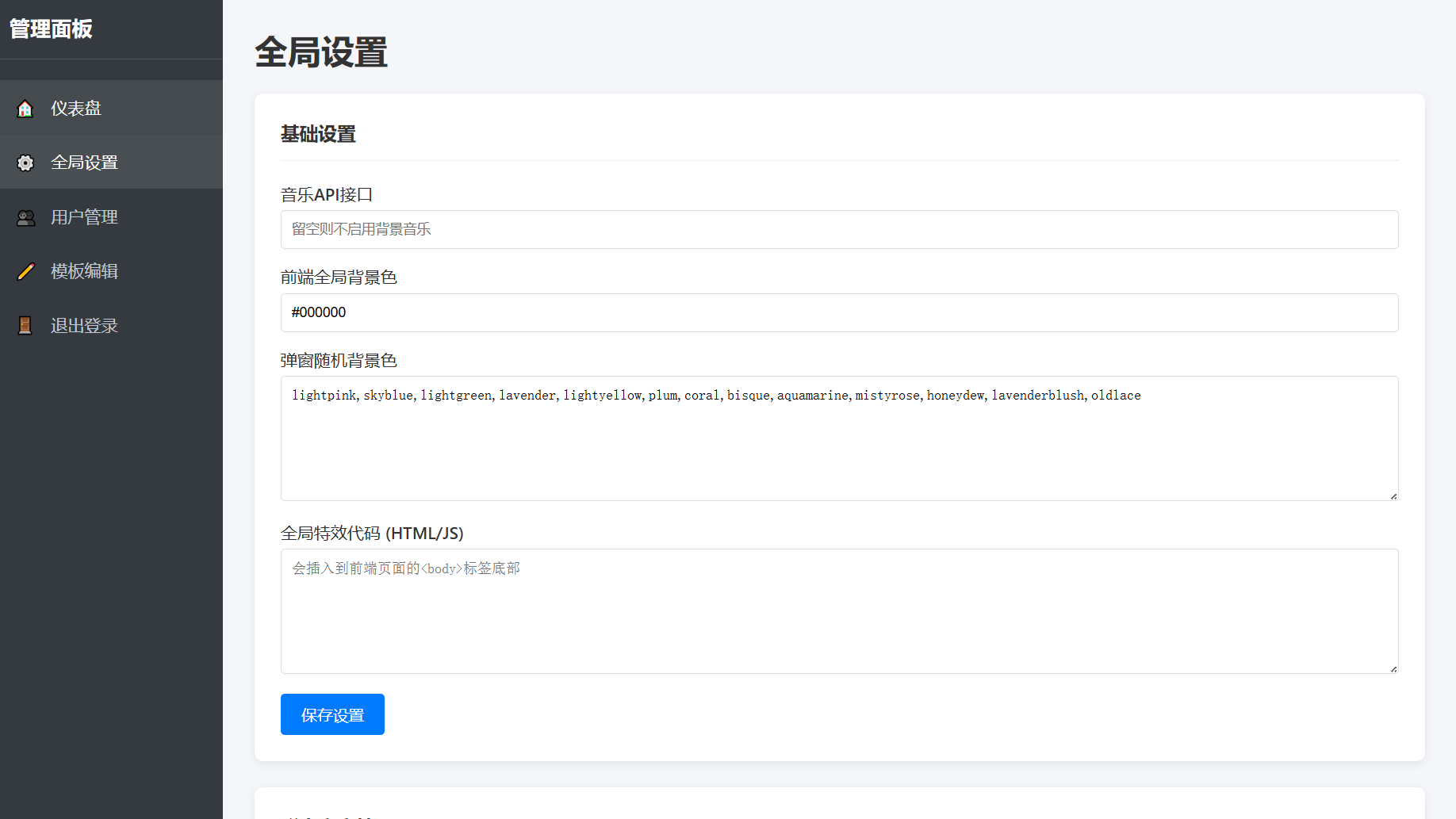- 全功能后台:账号与权限管理、弹窗文案增删改查、全局配色/音乐/特效代码注入、密码修改等。