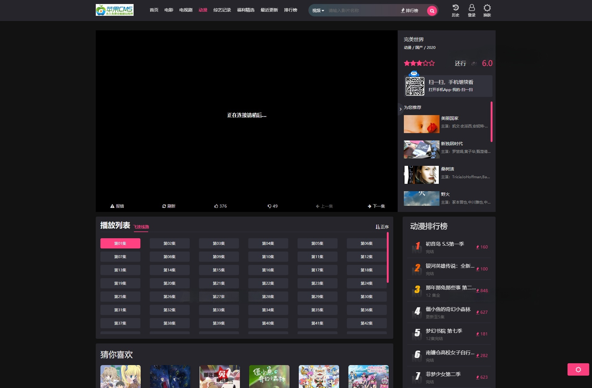 本模板基于苹果CMS V10或更高版本开发,采用经典的PHP+MySQL技术栈,确保高性能和稳定性。前端使用HTML5、CSS3和JavaScript(可能集成jQuery库),实现动态交互和响应式效果。代码结构清晰,遵循MVC设计模式,便于二次开发和定制;模板文件采用Smarty模板引擎分离逻辑与展示,提高维护效率。此外,模板支持缓存机制(如文件缓存或Redis),可加速页面加载,优化用户体验;数据库查询经过优化,减少服务器负载,适合高并发访问场景。