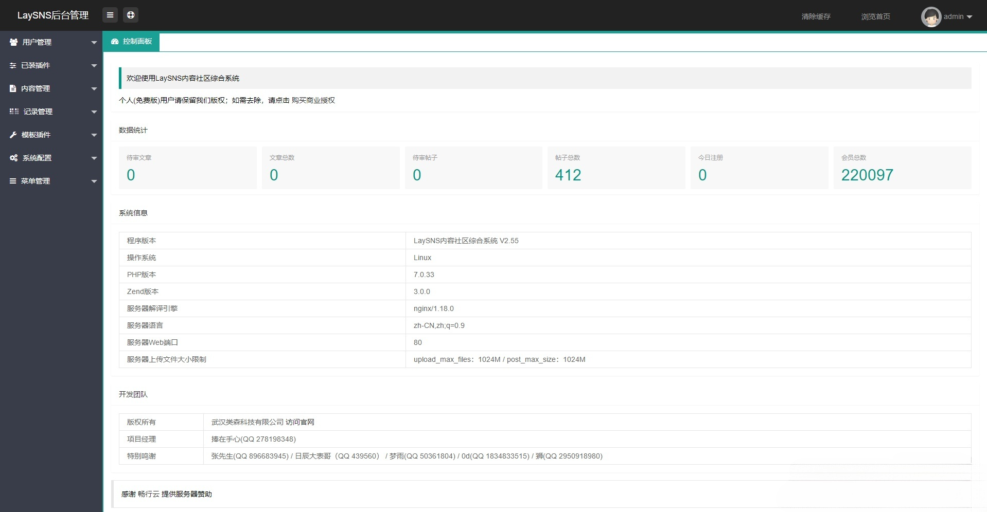 • 后台管理面板:基于LayUI构建响应式后台界面,提供直观的数据仪表盘、资源统计、用户行为分析和系统日志,支持一键配置和伪静态设置。