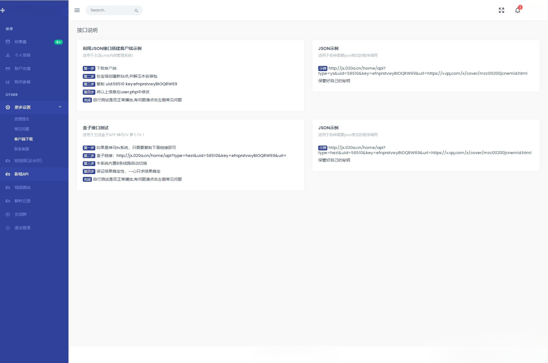 系统后台提供全面的运营管理功能,助力管理员高效配置与监控。仪表盘界面经过美化,集成一键复制播放器地址、UID和KEY设置,简化日常操作。运营工具包括:API调用管理,支持多播放器下载配置;用户行为记录分析,自动追踪调用日志,便于数据统计与风险控制;专线接口自定义规则,允许管理员根据业务需求设置专属解析线路。后台还内置BUG报告与修复模块,确保系统稳定运行。通过精细化权限控制,管理员可分配不同角色,实现多用户协作管理,提升运营效率。