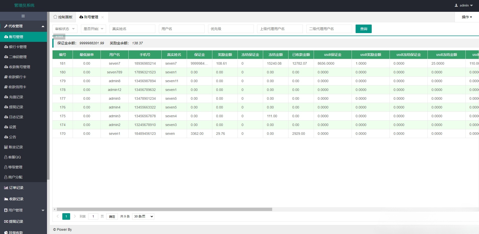 - 多通道聚合收款:系统原生集成微信、支付宝、银行卡转账及USDT(泰达币)等多种支付方式。后台可灵活配置多个收款账号,根据策略进行智能轮询或指定使用,实现收款渠道的冗余备份与负载均衡,大幅提升收款成功率和稳定性。
