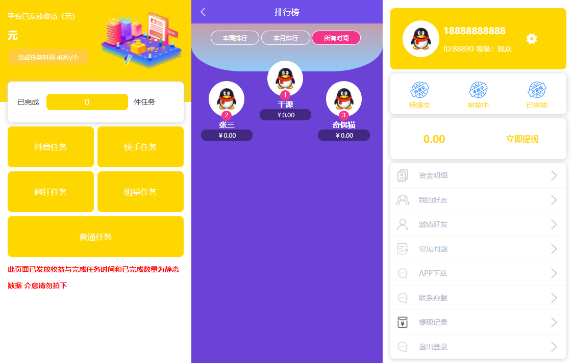 - 数据统计与报表:后台提供用户行为分析、任务完成率、收益统计等报表,支持导出和数据可视化,辅助运营决策。