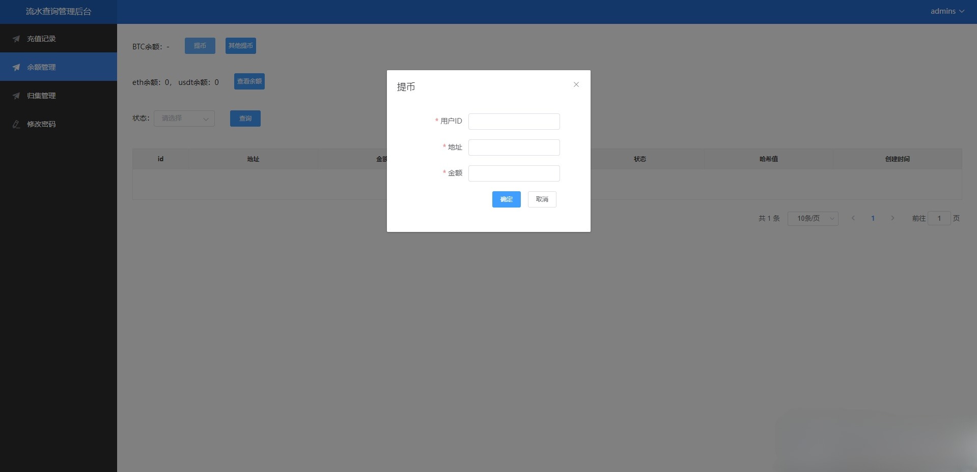 • 流水记录与查询:系统核心功能之一,用于记录所有通过系统发起的提币申请、充值记录(若集成)等资金流水。支持按时间、币种、用户、交易状态等多维度进行筛选和查询,形成清晰的资金变动台账。