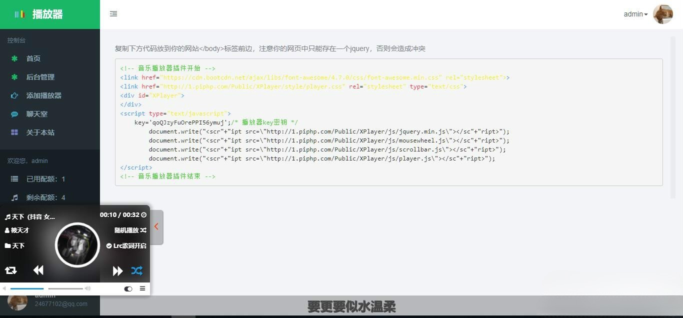 - 后台管理面板:提供管理员后台,用于管理音乐资源、用户权限、播放统计和系统配置,支持批量操作和数据导出。