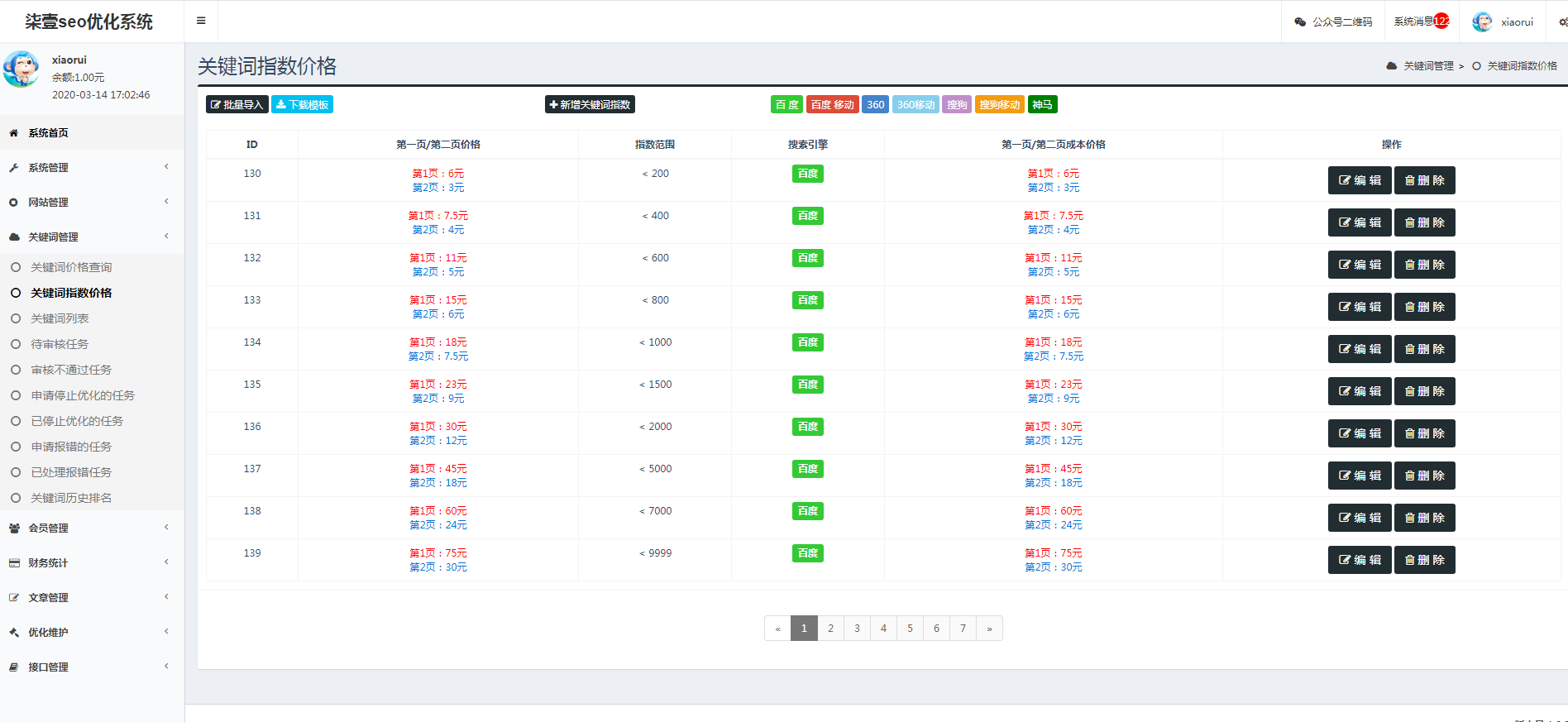 • 关键词管理:支持用户添加关键词,并可通过价格设置和指数查价两种方式添加,普通用户需通过后台审核。