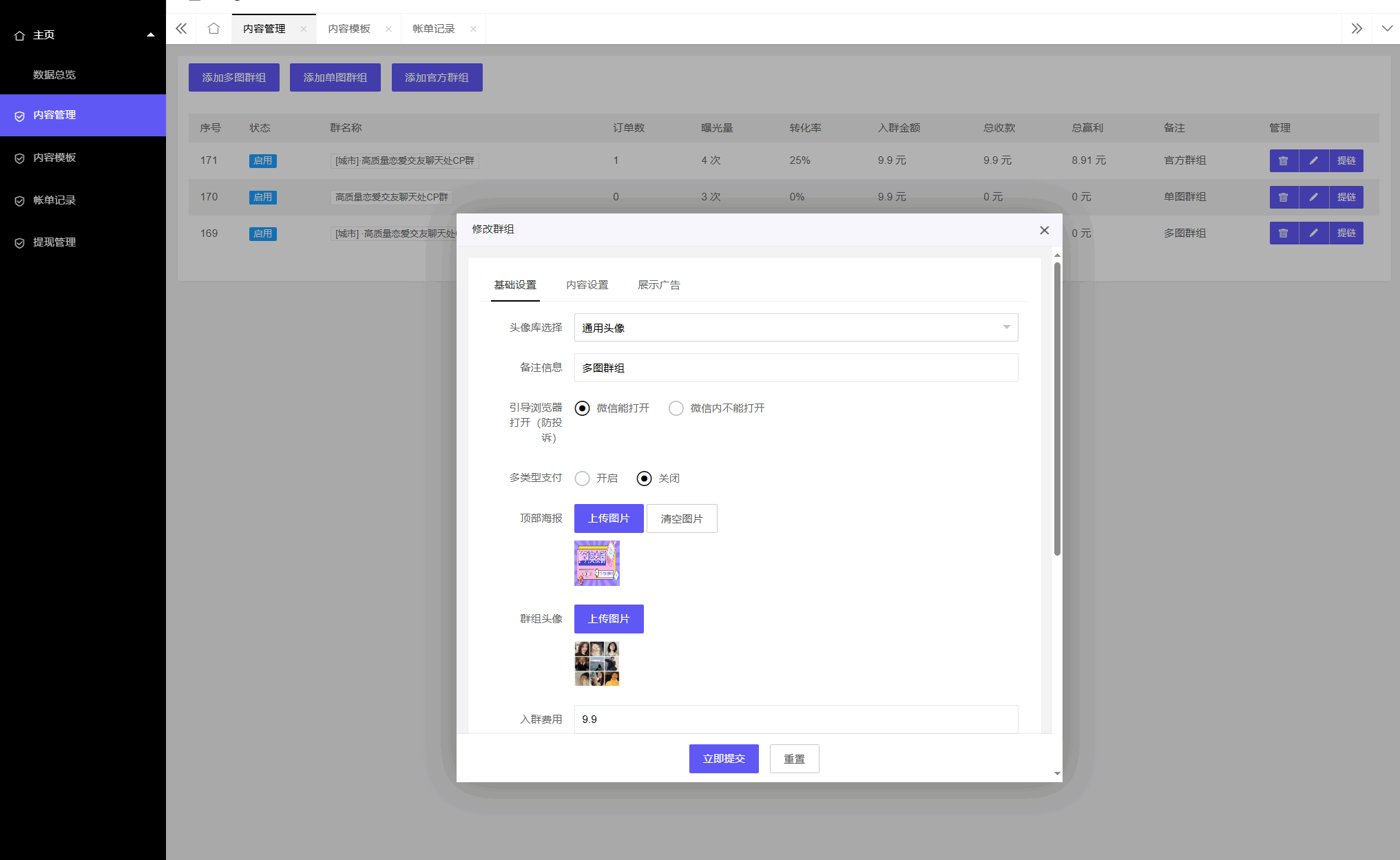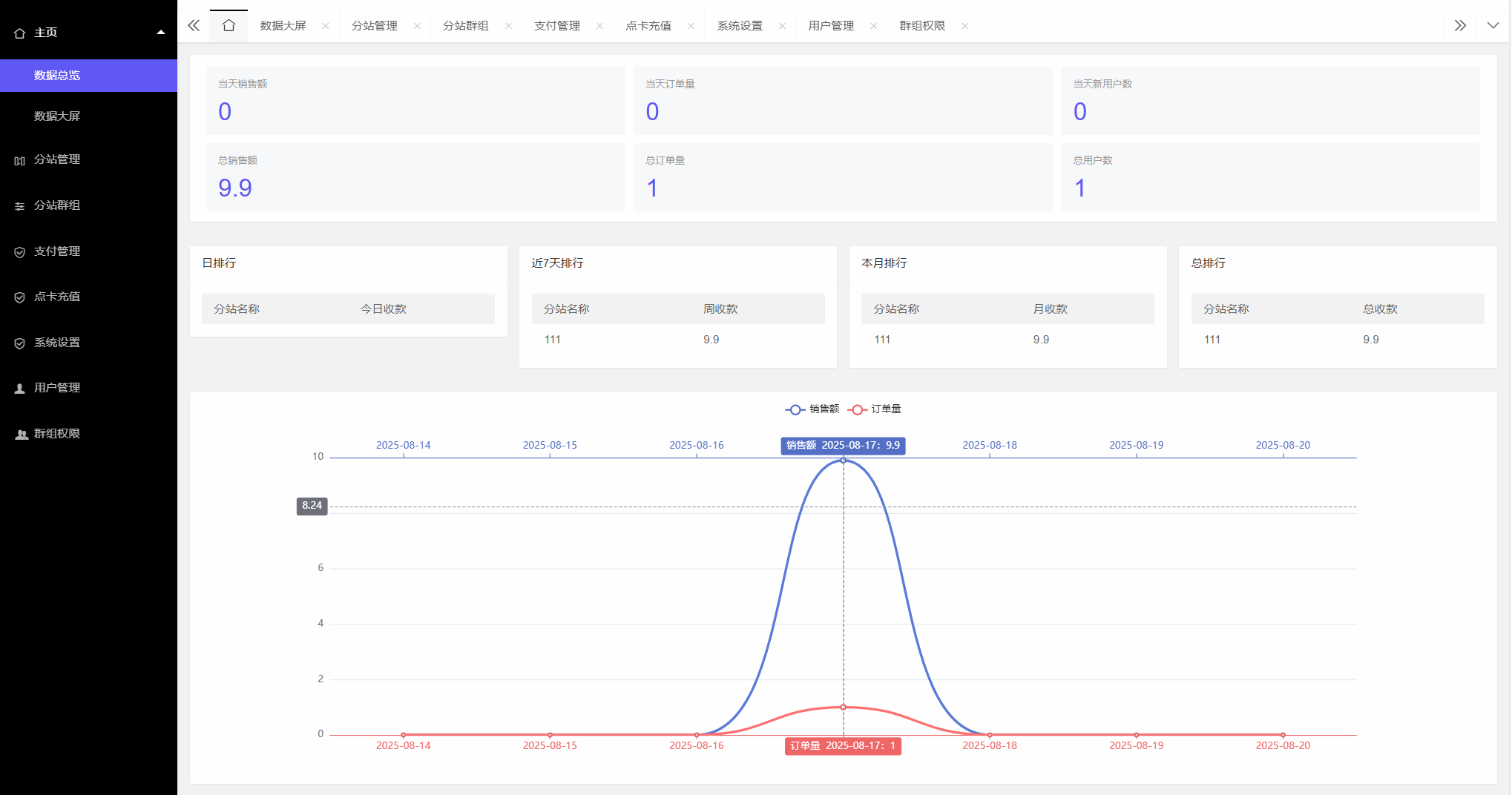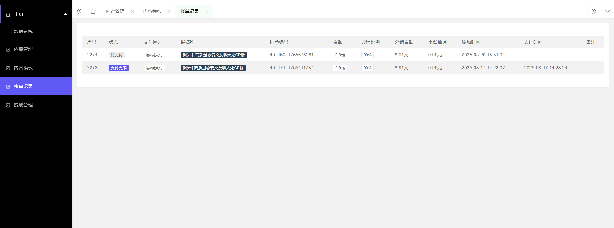 - 数据大屏展示:内置数据大屏,直观展示订单、进群人数、分站与代理相关数据,便于运营监控与活动分析。
