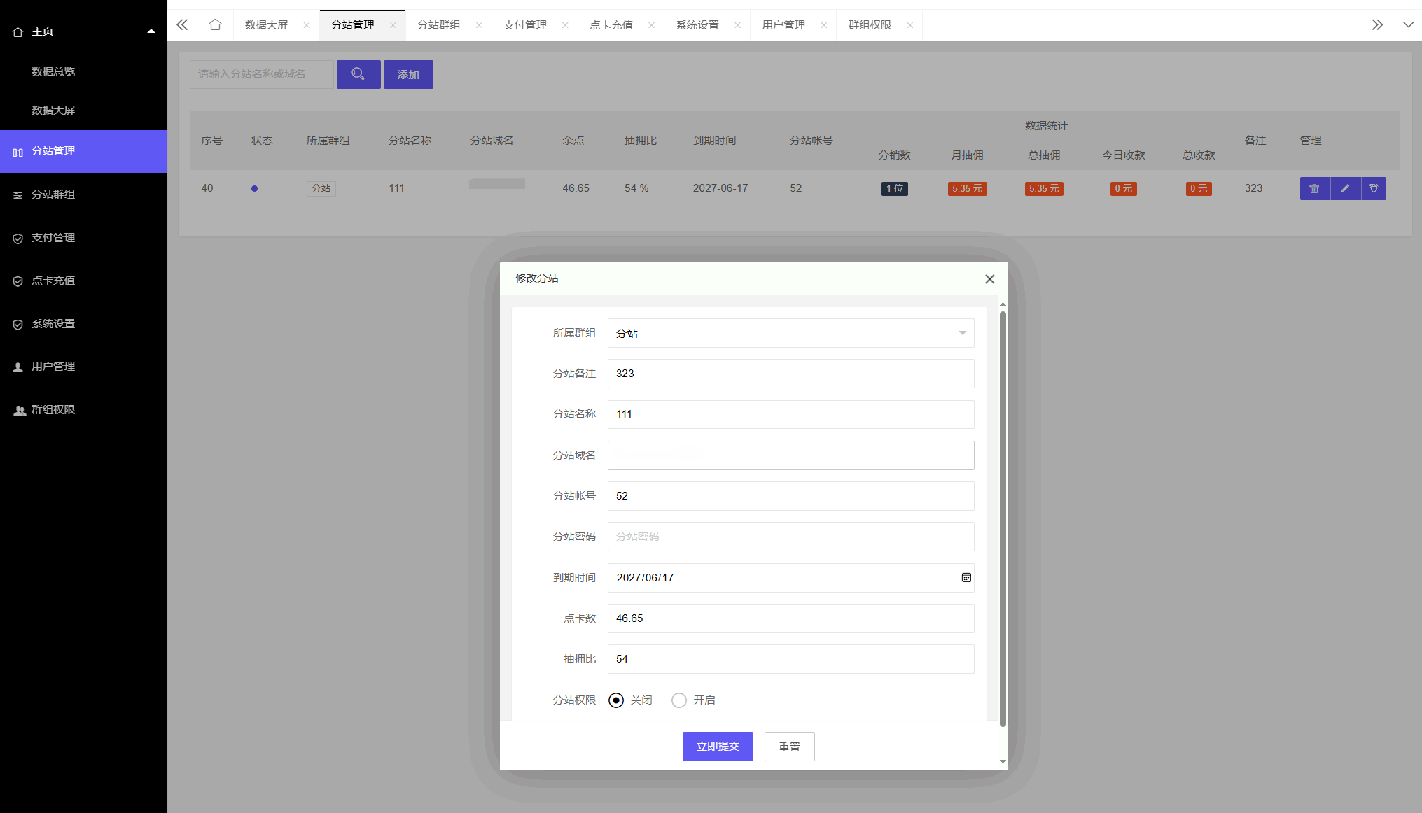 - 分站系统:内置分站功能,可无限添加分站,每个分站可单独设置支付接口和基础配置,方便多站点矩阵化运营。